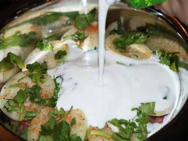 4. Налить кефир. В принципе его можно использовать любой жирности. Но я обычно покупаю жирностью 3,2 %. Такой кефир вкуснее сам по себе, а значит и маринад из него получается наиболее вкусным.