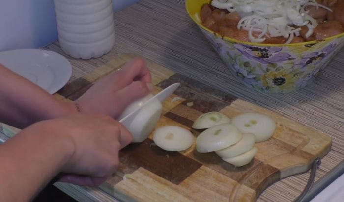 2. Лук порезать тонкими полукольцами. Стараться порезать его как можно тоньше, так он сильнее напитает каждый мясной кусочек своим соком.