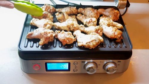 Обжарим мясо до красивой румяной корочки, не забывая периодически переворачивать его. Когда, при проколе ножом или вилкой, с ножек будет выделятся светлый сок – куриный шашлык можно считать готовым. Мне для желаемой прожарки понадобилось 30 минут.
