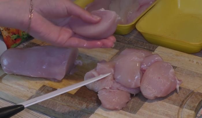 2. Далее вам предстоит ножом отделить спинку от грудинки. Плюс еще удалите шкурку. Измельчите мясо на небольшие кусочки, чтобы удобно было одевать их на шампур.
