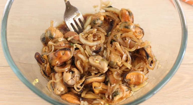 На этапе подготовки следует очистить мидии, если это предусмотрено рецептом, раскрыв раковины. Промывают мясо в прохладной проточной воде.