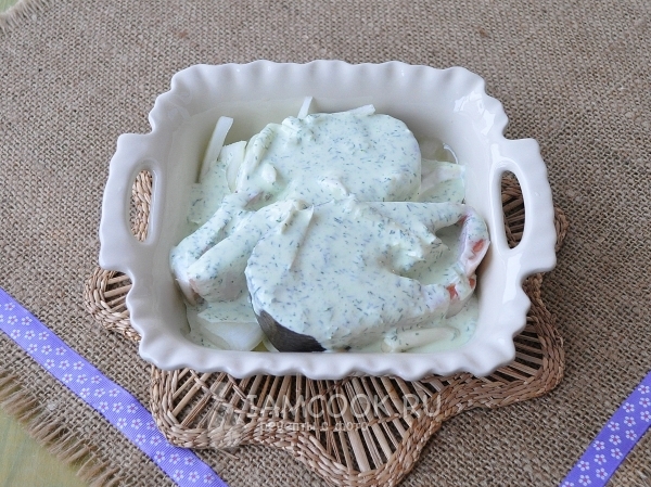 - Смазываем сверху куски сметанным соусом с зеленью.