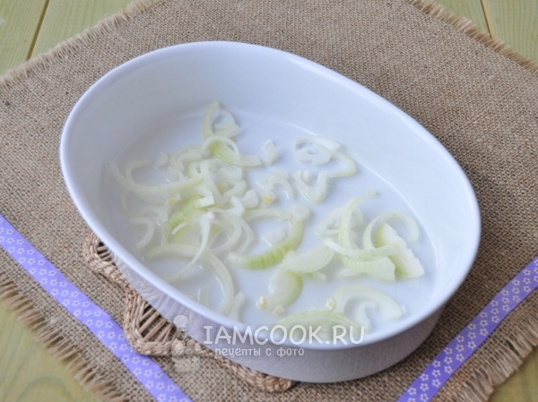 В форму для запекания нальём немного масла и выложим половину нарезанного лука.