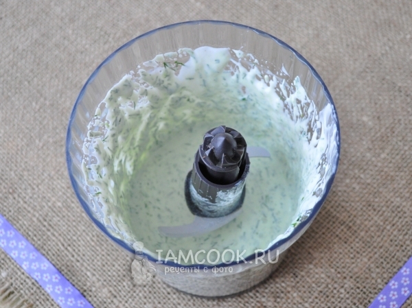 - В миске смешиваем сметану с майонезом и соком лимона. Зелень мелко нарезаем и отправляем в соус.