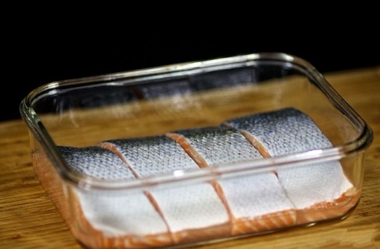 Выкладываем лосося в форму.