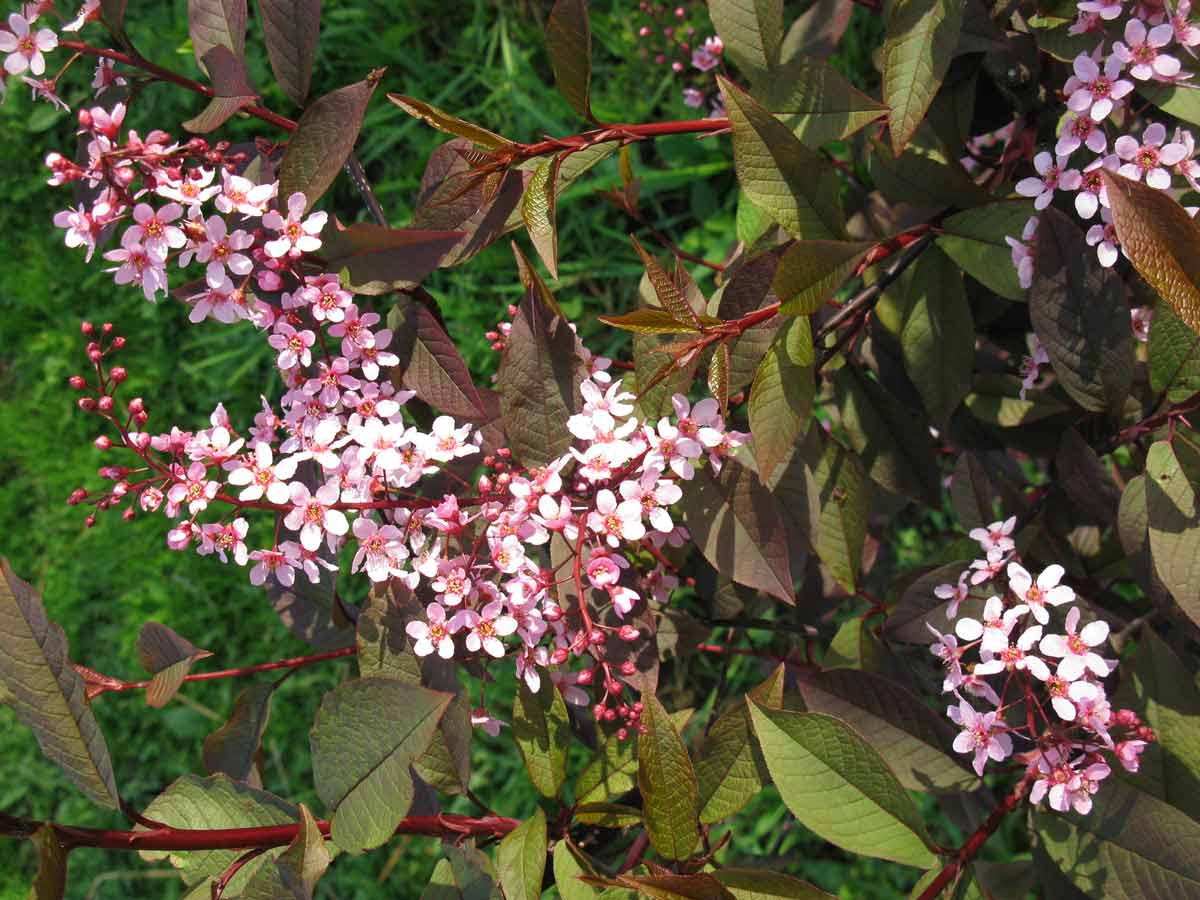 Черемуха обыкновенная ‘Колората’. Деревце или небольшой кустарник (5 м). Листья медно-фиолетового или пурпурного цвета, потом становятся зелеными. В осенний период листва окрашивается в красно-розовые тона.