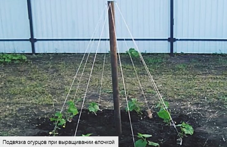- Рассаду рассадите по периметру окружности, и закрепите возле каждого куста столбик. От него пустите шпагат к опоре. По мере роста растений стебель будет оплетать шпагат, продвигаясь к центру. В результате у вас получится конструкция, напоминающая елку. Культивация огурцов таким способом должна осуществляться в один ряд. Оптимальное расстояние между кустами – 35 см.