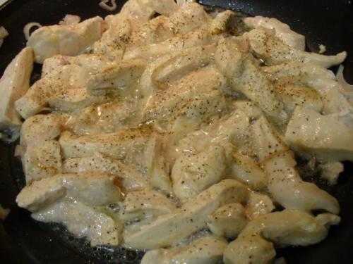 Вареную грудку нарезать ломтиками по полтора сантиметра.6. Добавить к обжарке.7. Выдержать смесь до тех пор, пока не испарится жидкость.8. Добавить и очень быстро размешать муку.9. Долить сливки.10.