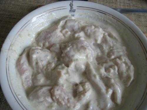 В глубокой тарелке смешайте кефир и специи, то есть соль, черный молотый перец и сушеную зелень. Затем положите в этот маринад кусочки куриного филе, смешайте и оставьте на 1,5 — 2 часа. Если у вас на кухне достаточно тепло или жарко, то лучше уберите мясо в кефире в холодильник, если в комнате прохладно, то оставьте все на столе, лишь накрыв чем-нибудь.