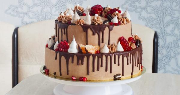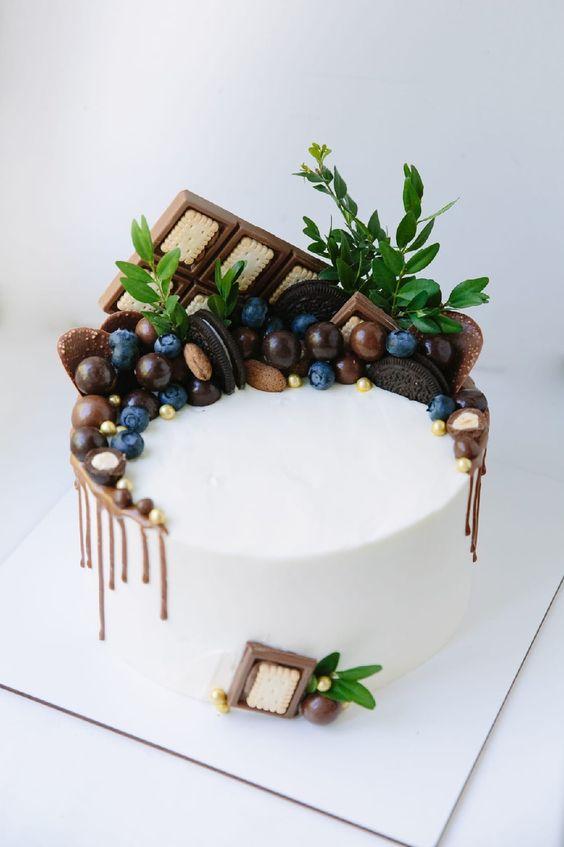 Шоколадные подтёки и ягодный декор – это всегда красиво. Для украшения торта таким образом можно использовать как белый, так и тёмный шоколад. А другие ягоды помогут разнообразить эту композицию.