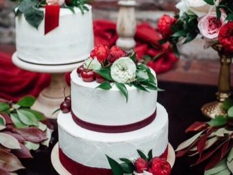 Изумительно на любом праздничном столе будет выглядеть многоярусный торт исключительно из красных ягод. Использование их на белом фоне с вкусным и сладким кремом позволит создать аппетитный десерт, который будет поражать кулинарную фантазию гостей и молодой пары ввиду присутствия разных ягод одной цветовой гаммы, но разных вкусовых качеств. Начинка в этом случае может быть разной, но наличие в ней небольшого количества фруктов или ягод будет приятным дополнением десерта.
