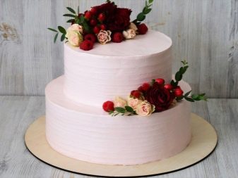 Молодоженам, которые любят ягоды и считают их не только полезной и важной пищей, но и замечательным вариантом декора, понравится одноярусный десерт, на котором в оригинальной композиции размещаются красные и синие плоды разной формы и размера. Такая композиция добавляет торту индивидуальности, а внешне он смотрится очень аппетитно