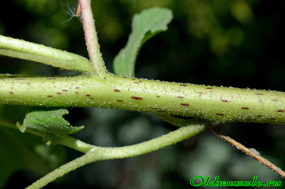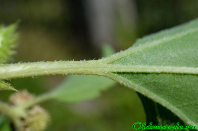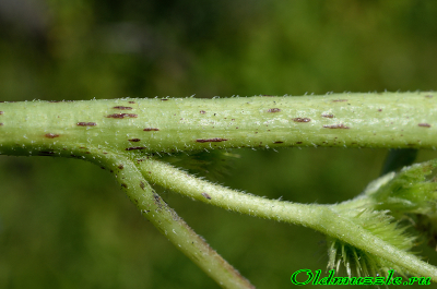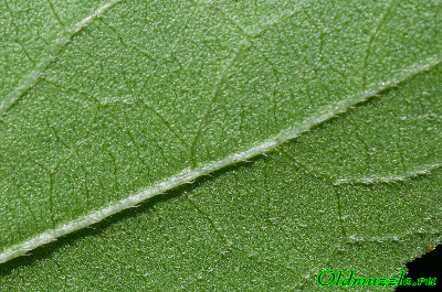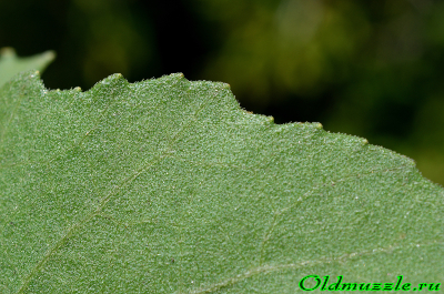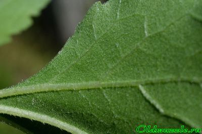 Листья снизу не войлочные, с обеих сторон с щетинистыми волосками. Край листа неравномерно пильчато-зубчатый, реснитчатый. Жёлтых желёзок я так и не нашёл, хотя и пытался. Возможно, их тут и нет.