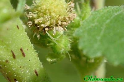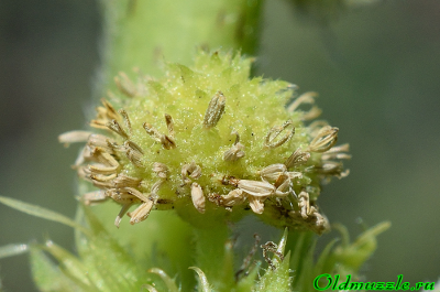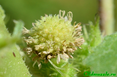 Взглянем поближе. Корзинка с тычинками состоит из множества цветков. К сожалению, контрастности никакой нет и разглядеть мало что возможно, тем не менее попытаемся. В центре левого фото — отдельный цветок корзинки. Из него торчит серо-коричневая фигня, похожая на засохшую часть растения. Это и есть тычиночный цветок. Как выглядит околоцветник — непонятно, потому что его листочки зелёного цвета и покрыты мелкими желёзками. Попробую как-нибудь отснять более детальнее, но точно не в этом (2019) году. Пыльники собраны в кучу и кажется, что это просто что-то засохшее. Смотрим на правую фотографию: в нижней части корзинки виден распустившийся тычиночный цветок. У него пять пыльников, расположенных звездообразно.