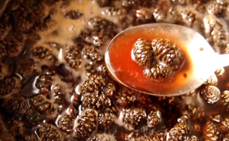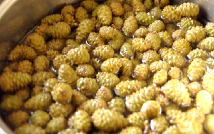 - Далее необходимо в сироп выложить шишки сосны и варить в течение двадцати минут.