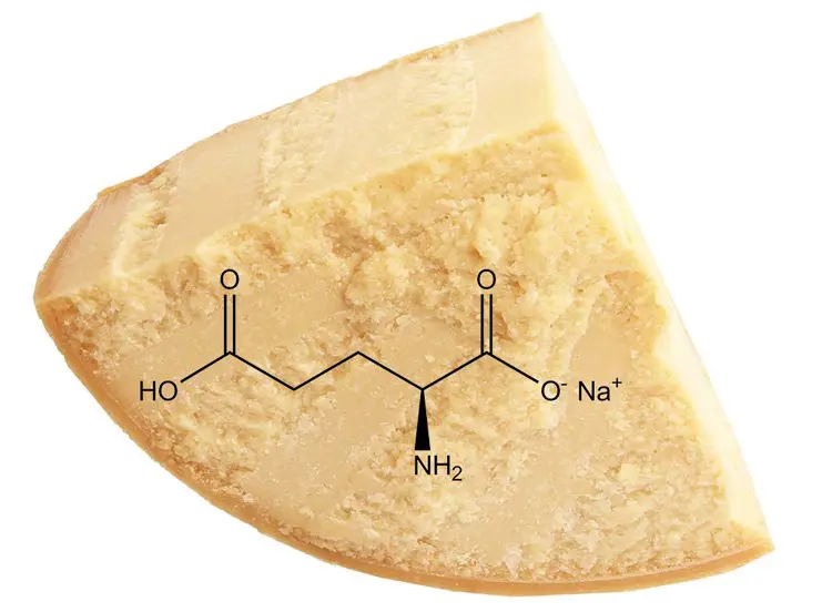 В большинстве белковых соединениях присутствует аминокислота глутамат. В процессе производства и созревания пармезана она вступает в реакцию с натрием и водой, создавая внутри головки натуральное соединение глутамата натрия. Данная аминокислота положительно влияет на работу мозга и метаболизм организма, а также придает пармезану его неповторимый вкус. В натуральном виде глутамат натрия можно встретить также в томатах или грибах.