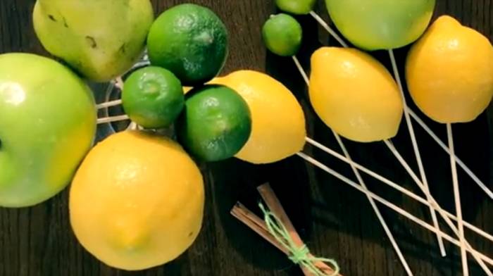 - Убедитесь прочно ли закреплён плод. Установите его на стол, если всё держится, значит, можно использовать в композиции. Остальные фрукты можно сразу крепить на палочки.