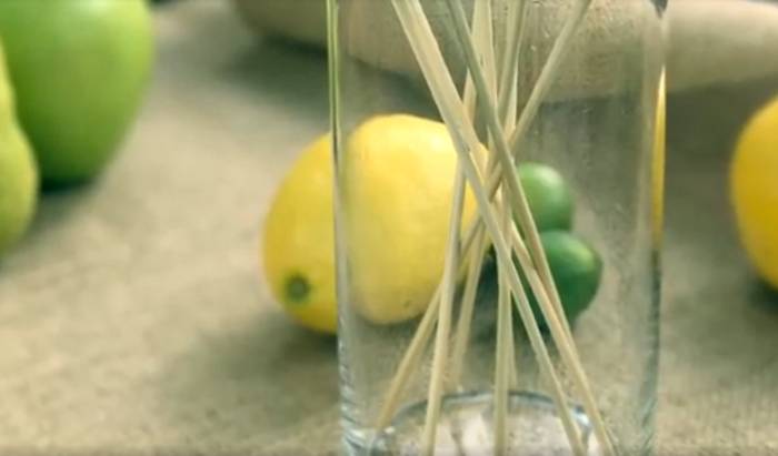 - С помощью скотча приклейте к центру бутылки 7-8 шпажек.