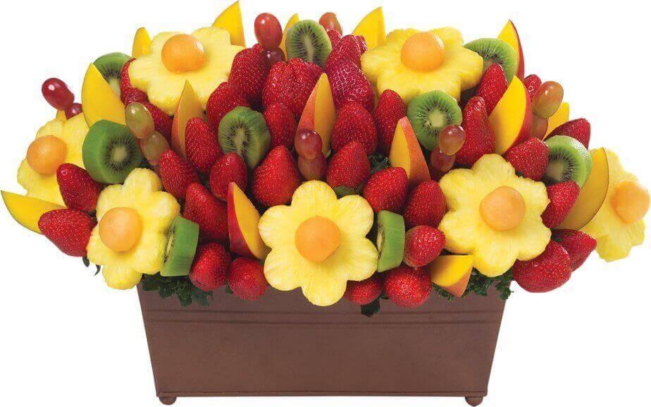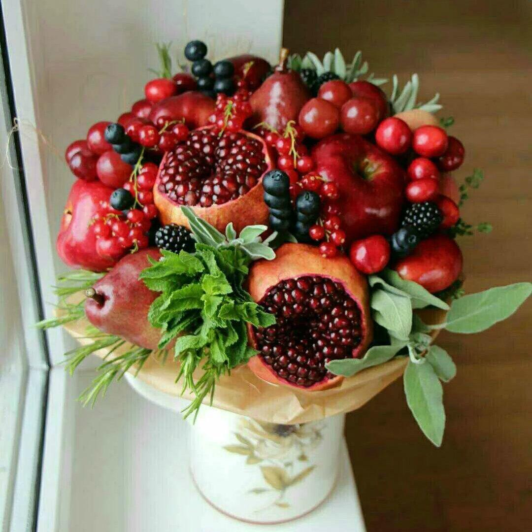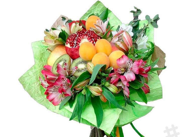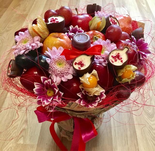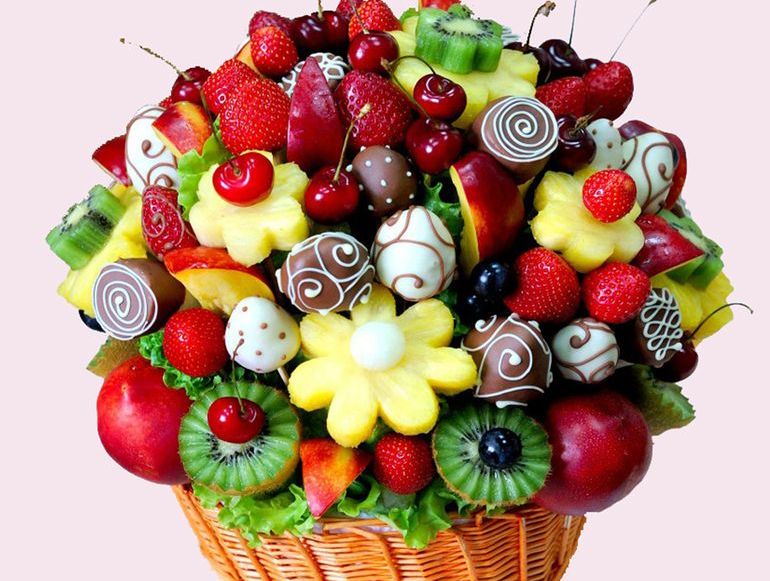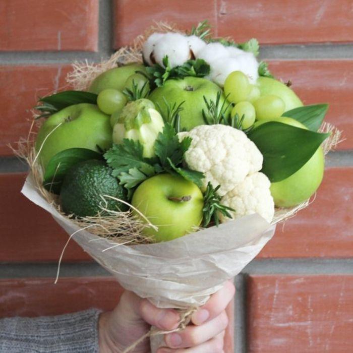 Неповторимость живой связки из красиво нарезанных или целых плодов будет отмечена и одаряемым, и гостями праздника. Иногда вместе с фруктами в такой букет добавляют живые цветы или листья растений, зелень или овощи, иногда шоколадные сладости.