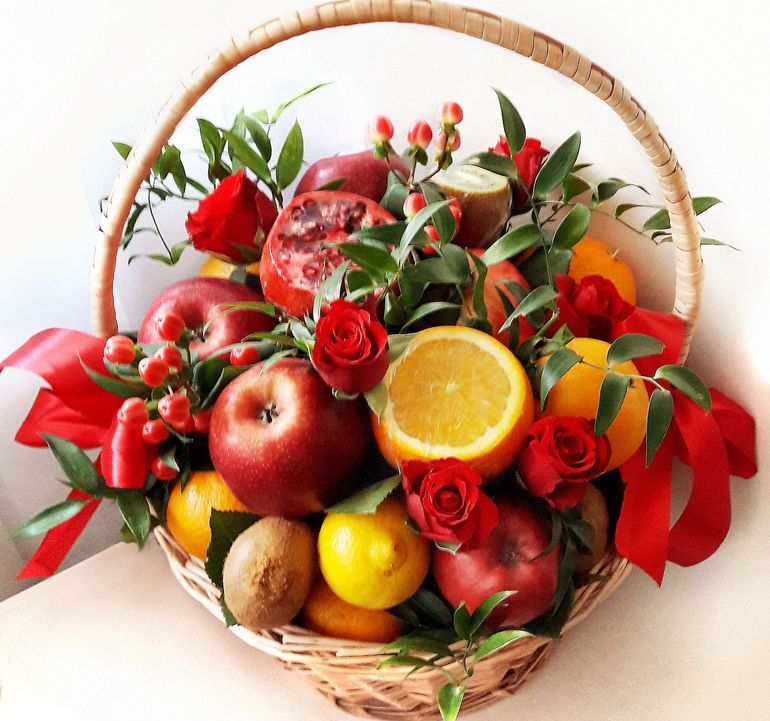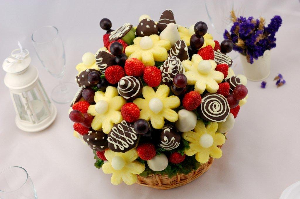 Из фруктов и цветов можно собрать композиции самых разных форм и размеров. Все зависит от вашей фантазии и того, сколько времени вы готовы посвятить творчеству.