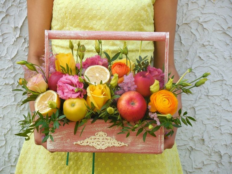 Самый простой способ собрать фруктово-цветочный букет – это сложить все в корзине.