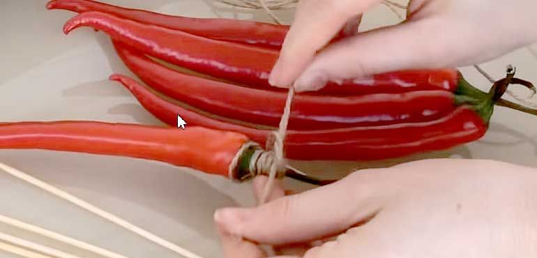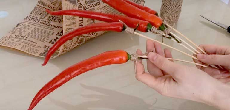 Фиксируем острый перец на шпажках. Обматываем основание с чашелистиком бечевкой.
