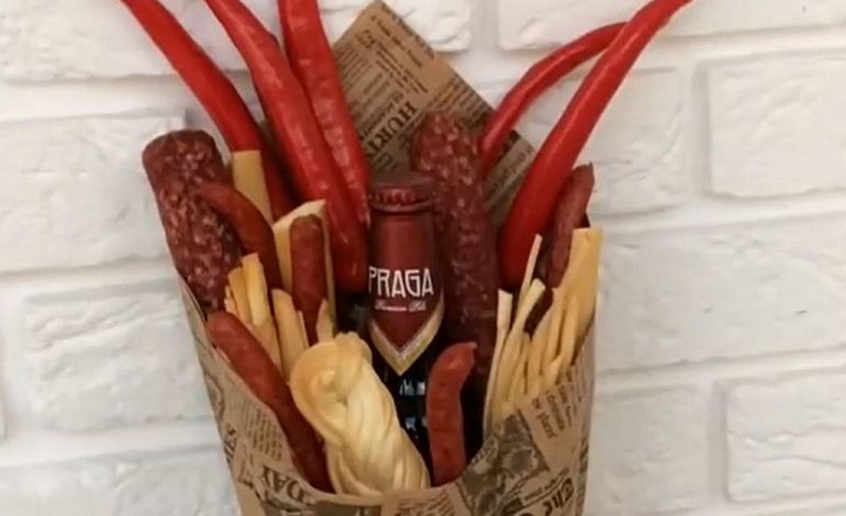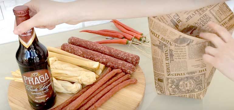 Варианты мужских букетов больше ассоциируется с брутальным составом: пивом, мясом, сыром, горьким перцем, чем сладкими конфетами или фруктами. Поэтому приведем пошаговый мастер класс простого съедобного букета, сделанного своими руками на праздник для мужчины ко дню рождения, 23 февраля или профессиональному празднику. В композиции минимум шпажек, можно его сделать, даже если до этого никогда не работали в этом направлении. Простота объясняется простым способом сборки букета в конверт из плотного крафта. Подготовим: