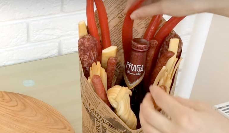 Инструкция как сделать композицию из продуктов для мужчины с описанием этапов сборки: