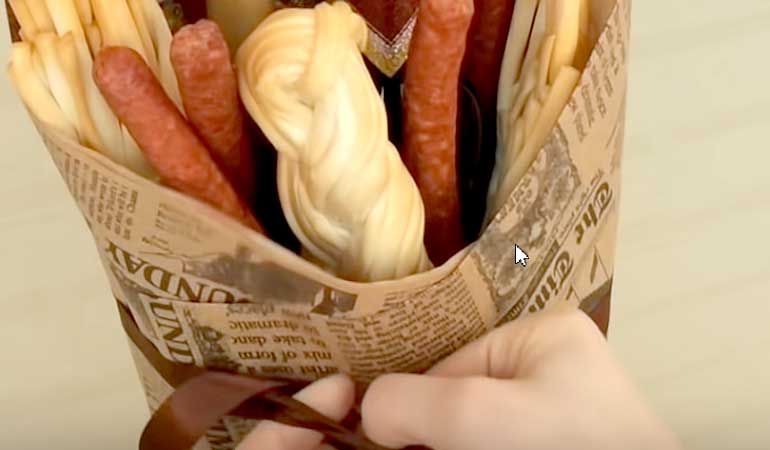 Обматываем букет прозрачной пленкой, чтобы продукты не обветрились. Повязываем концы пленки сверху лентой. Во время вручения или сразу после него пленку можно легко снять, она ничем не скреплена и легко развязывается.