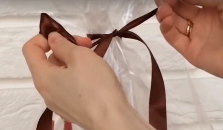 Наполненный пакет обвязываем коричневой атласной лентой.