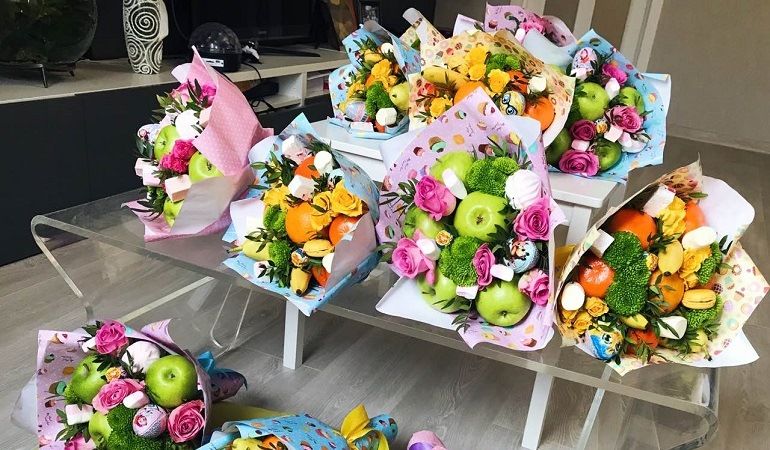 Когда вы научитесь изготавливать простые букеты из фруктов, можно поэкспериментировать и создать оригинальную композицию с помощью дополнительных ингредиентов.