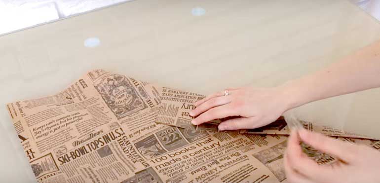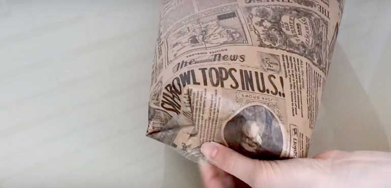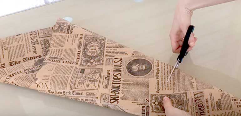Из плотной упаковочной крафт-бумаги с газетным принтом делаем конверт для подарка. Лишнюю часть отрезаем.