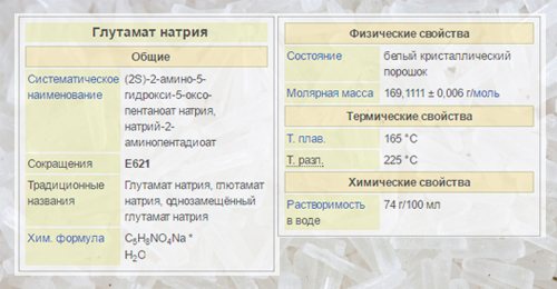 Глутамат натрия является усилителем вкуса и аромата, добавляется в пищевую продукцию для улучшения вкуса или для того, чтобы замаскировать негативные свойства продукта. Е621 имеет свойства консерванта, сохраняет качество продуктов при длительном хранении.