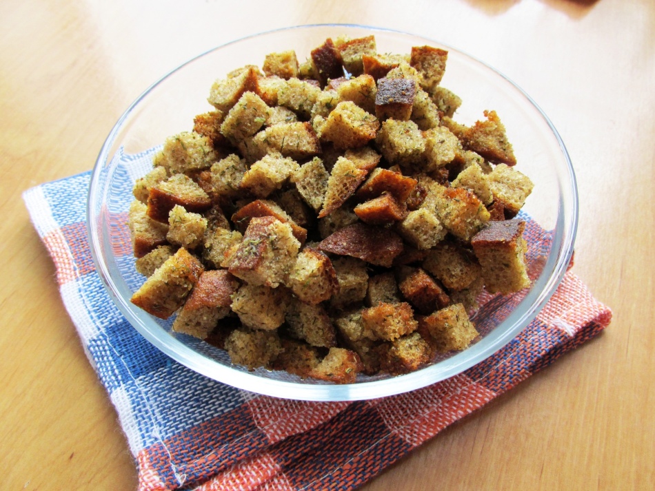 - если хлеб сильно высох, не нужно пытаться его порубить кубиками, он лишь раскрошится, предварительно понадобится сбрызнуть кусочки водой и подогреть в микроволновке;