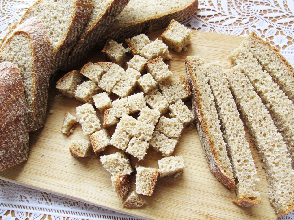 - Из свежего хлеба не получиться приготовить хрустящие сухарики. Берите вчерашнюю булку, которая слегка подсохла. Такой хлебец во время обработки не будет крошиться, да и нарезать его легче.