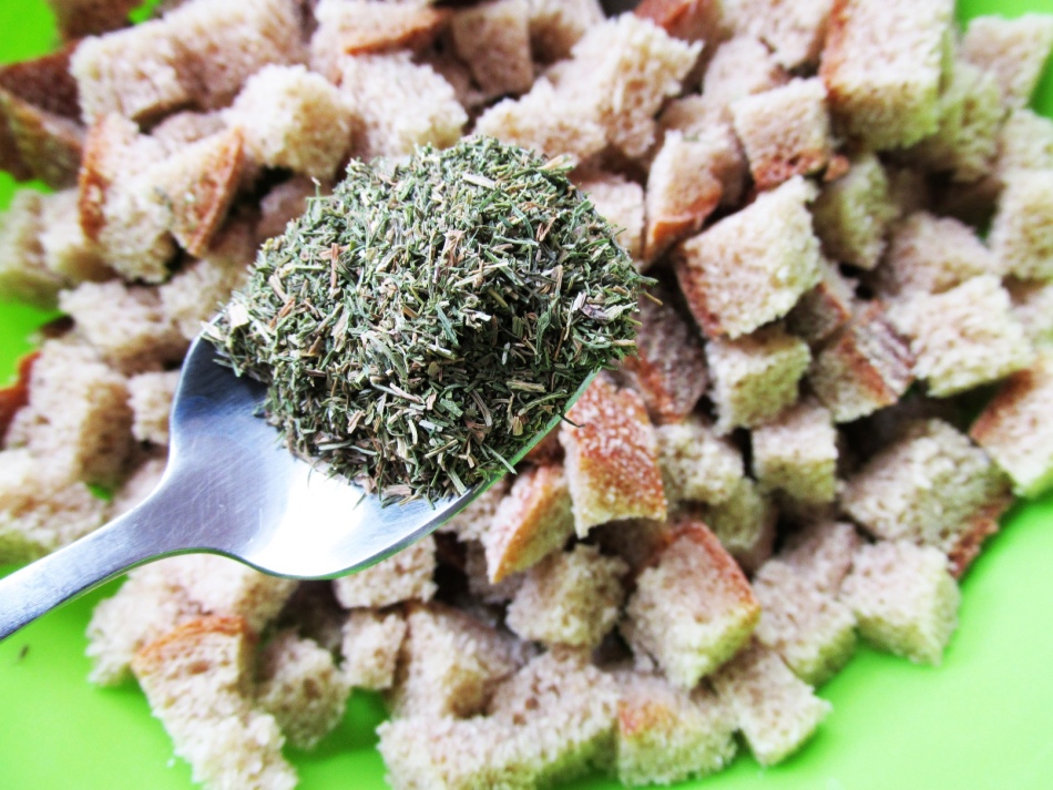 Отправляем в миску со смесью из приправ хлебные кусочки. Снова все перемешиваем, пока масло не впитается.
