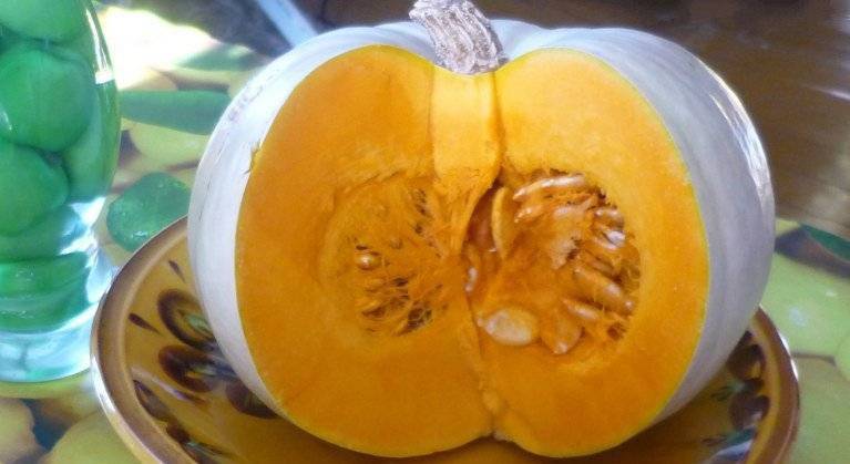 Характеристика плодов. Тыквины считаются порционными, так как их вес достигает 2,5-3 кг. Они покрыты деревянистой светло-серой (иногда практически белой) корой с едва заметными розоватыми пятнами. Форма тыквы плоская, округлая. Плотная ярко-оранжевая мякоть не волокнистая, характеризуется сладким вкусом, сахаристостью. Плоды отлично хранятся в комнатных условиях.