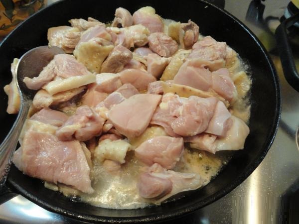 - В небольшом количестве масла обжарьте сначала луковую нарезку. Затем забросьте кусочки филе. Жарьте примерно 8-10 минут.