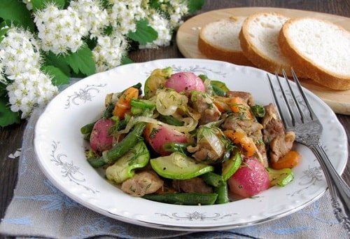 После готовности блюда мясо должно полежать в бульоне или на сковороде под крышкой не менее 15 мин. Это придаст сочность и мягкость мясу.