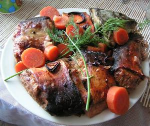 - Голова рыбы, обычно рыбное блюдо с целой рыбой, голова цела