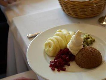 Особенностью обеденного меню является закуска из рыбы, например, пропущенный через мясорубку форшмак, приготовленный из малосольной сельди с добавлением яблок, лука и размоченного хлеба. Затем подают суп, как правило, мясной и второе блюдо из мяса, нередко без гарнира. Трапезу завершает чай со сладостями.
