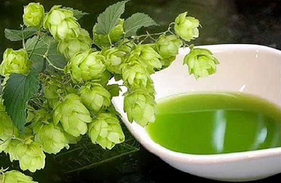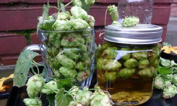 Перекладывают столовую ложку растертых хмелевых шишек в эмалированную посуду с литром горячей воды. Устанавливают на водяную баню и томят в течение 20 минут.