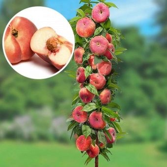 - Новый вид плоского лакомства – персик колоновидный инжирный. Дерево небольшое, 2-3 метра. Небольшая длина боковых ветвей придает дереву форму колонны. Компактность растения не требует больших участков земли. У плодов большой размер – до двухсот грамм. Колоновидные разновидности легко можно утеплить на холодный период. Но в центральной России фрукты не успевают вызреть, поэтому вид подходит для более южных регионов: Воронежская область и дальше на юг.