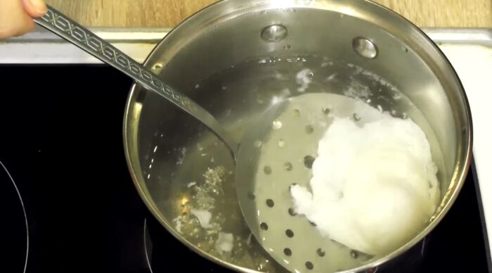 Достать готовое яйцо-пашот нужно шумовкой. Если по краям загустевшего белка все же образовались некрасивые нити, их можно обрезать.