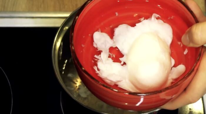 Погружение продукта в холодную, а лучше ледяную воду — самый легкий способ подготовки к очистке. По мере прогревания ее необходимо сливать, заполняя посуду новой жидкостью нужной температуры, пока белки и желтки не остынут полностью. Обычно процедура занимает около 15 минут.