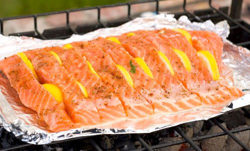 1. На мангале можно очень вкусно запечь семгу в фольге. Для этого нужно вначале промыть и очистить от чешуи стейки, затем натереть с обеих сторон их солью, перцем и любыми приправами. В качестве приправ лучше брать те, что для жарки рыбы.