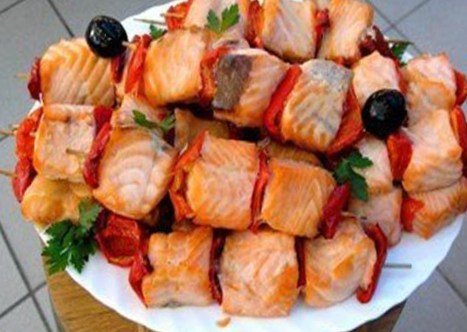 Шашлык из форели (семги) на шампурах с овощами