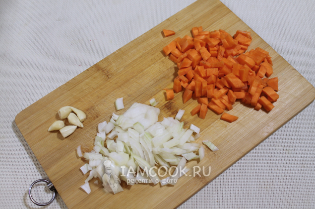 Лук и морковь очистите и нарежьте среднего размера кубиком, очистите несколько небольших долек чеснока. Их просто придавите тыльной стороной ножа.