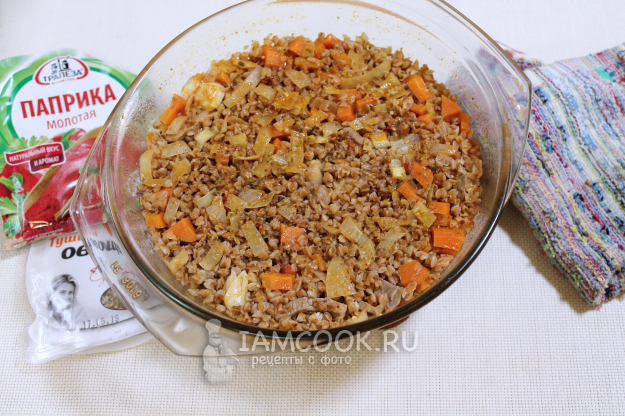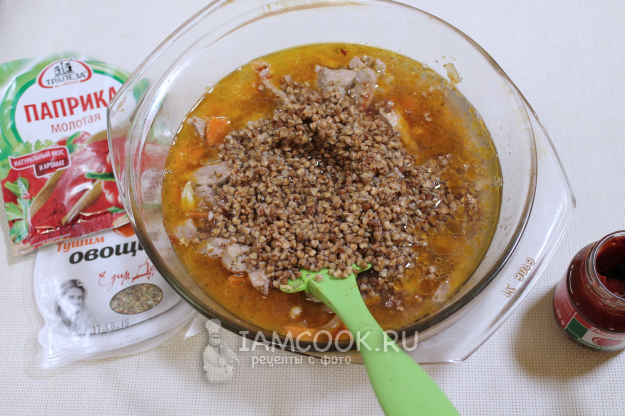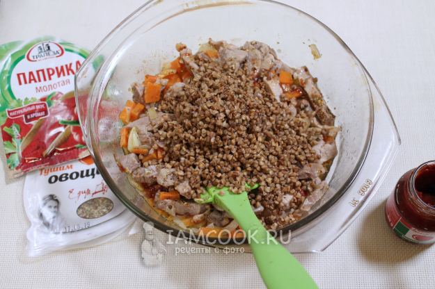 В посуду для микроволновки засыпать промытую гречку, положить пассерованные овощи, открыть тушенку, смешать все ингредиенты.