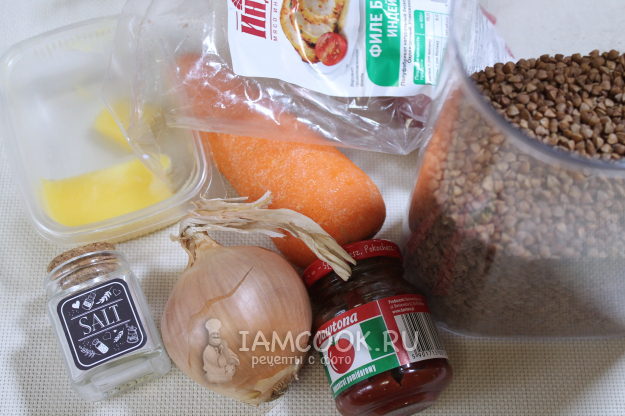 Возьмите продукты для приготовления гречки по-купечески с индейкой в микроволновке.
